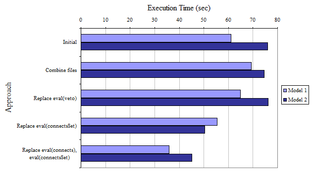 To compare, I made some graphs. These metrics are not very reliable, as each test was only executed once, and garbage collection was not completely accounted for; however, I think it represents a realistic collection of data for comparison purposes. The first graph compares the execution time for inferring two different models.